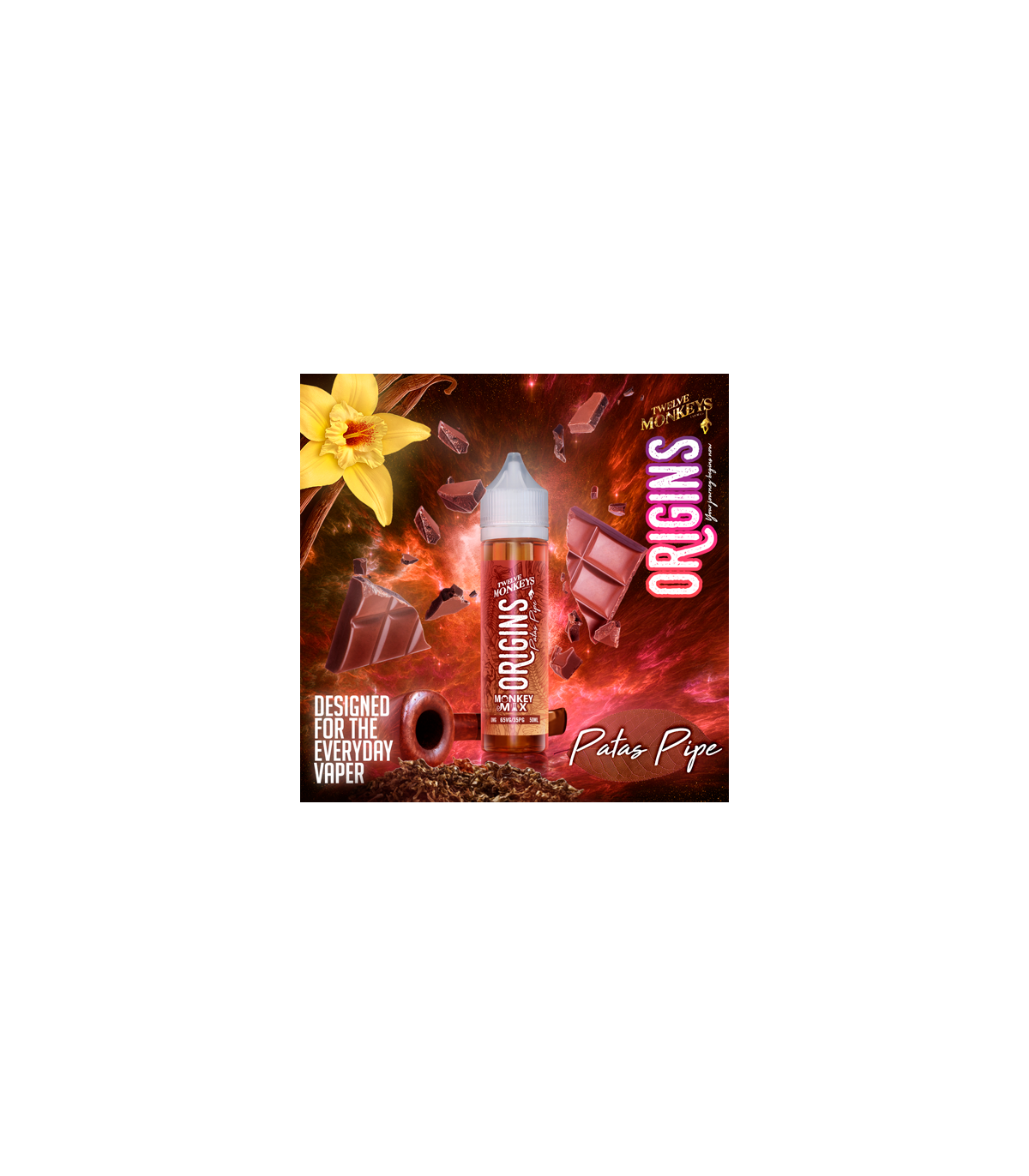 Twelve Monkeys Origins Patas Pipe espectacular sabor a tabaco de cuerpo entero, cubierto con una pequeña cucharada de vainilla cremosa y espolvoreado con un rico chocolate.